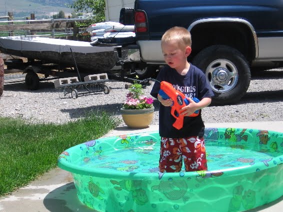 Carver had a blast today. We bought him a pool today at Walmart and of course, he found his squirt gun and proceeded to water everything. His swim trunks were a little big. So they kept sagging and I thought it was cute. :)